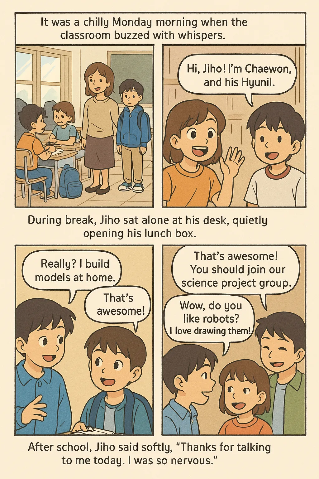 방과 후, 지호가 조용히 말했다. “오늘 나한테 말 걸어줘서 고마워. 정말 긴장했었어.”