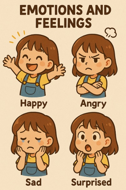 사용 영단어 : I, feel, happy, sad, angry, tired, fun, play, cry, smile, laugh, help, love, friend, day, good, bad, nice, talk, hug