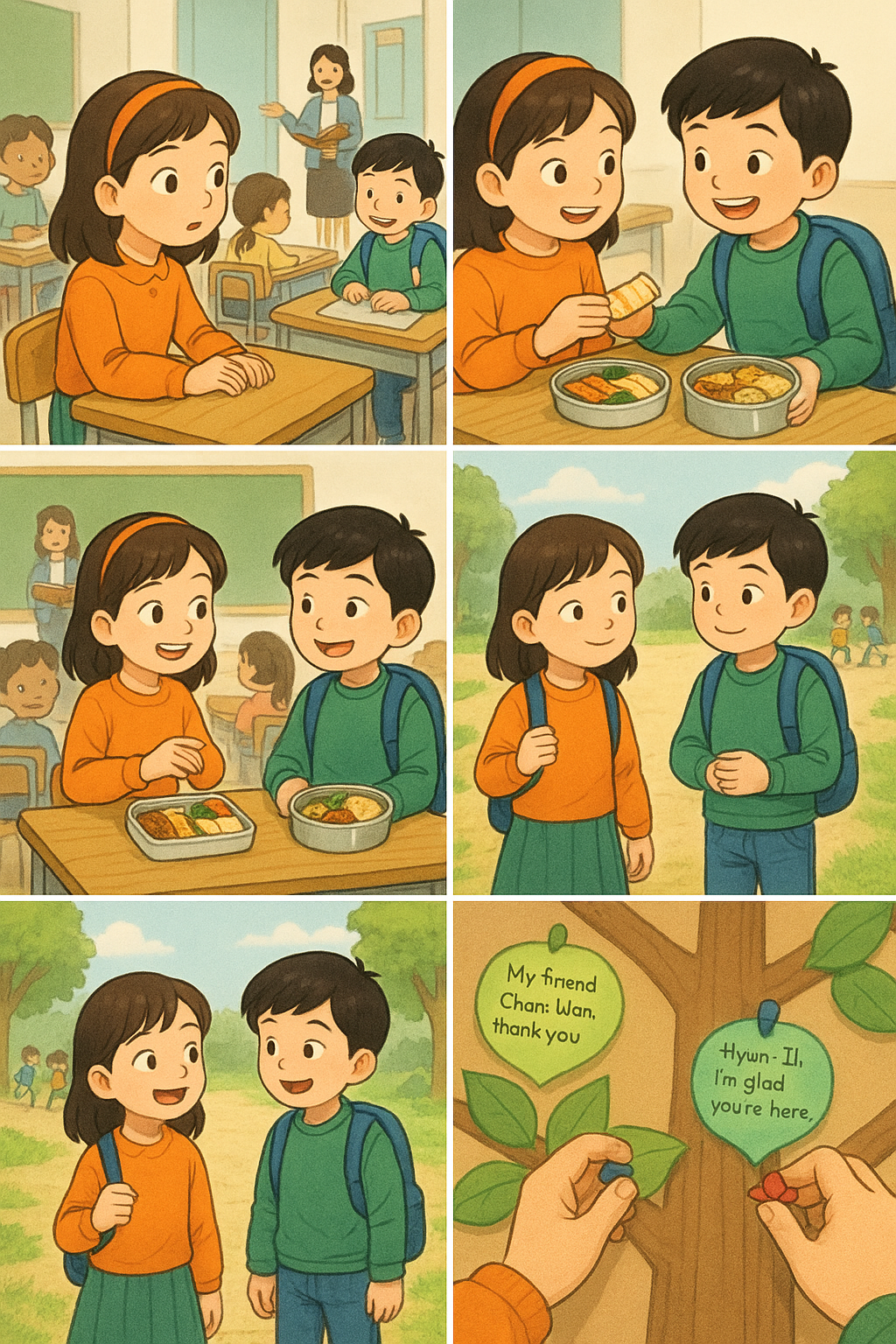 어느 날 선생님은 교실에 종이 트리를 세워 학생들이 서로에게 메시지를 쓸 수 있도록 했습니다. 현일이는 "내 좌석 동료 채원아, 모든 것에 감사해"라고 썼습니다. 동시에 채원이는 "현일아, 너는 매일을 즐겁게 해"라고 썼습니다. 두 사람의 잎사귀는 같은 나뭇가지에 놓여 마음이 어떻게 연결되는지 보여주었습니다. 우연히 시작된 우정은 그들의 친절과 용기 덕분에 더욱 강해졌습니다.