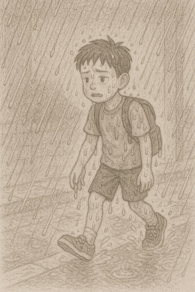 그는 밖으로 나섰고, 빗방울이 머리에 떨어졌어요.
