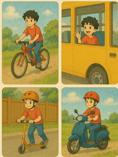 사용 영단어 (예시 50개 중): I, ride, go, car, bus, bike, train, walk, fast, slow, stop, road, school, home, friend, fun, see, wait, travel, happy