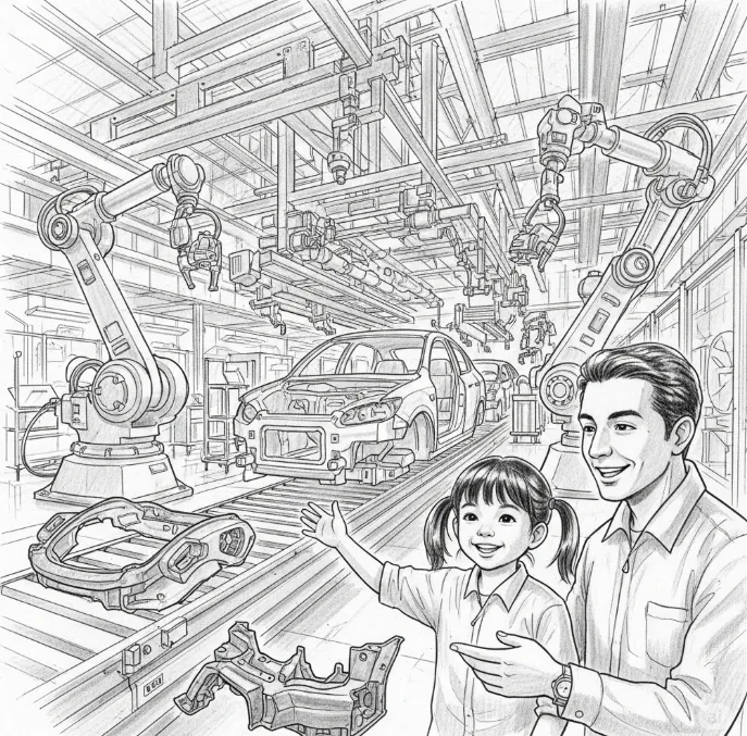 "우와! 진짜 로봇이 자동차를 만들고 있어!"라고 감탄했어요.