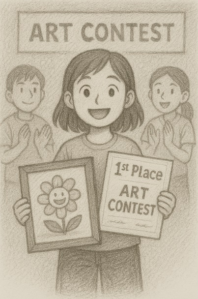 Today I woke up feeling excited again. It was the day of the school art contest results. I put on my lucky socks and quickly ate breakfast. My mom wished me luck as I headed off to school. On the way, I ran into my friend, Jina. She also entered the contest. We talked about our paintings and tried to calm down.