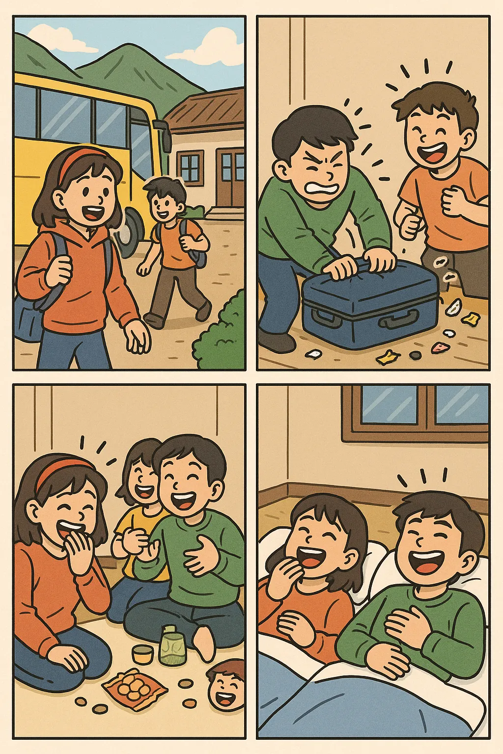 학생들은 수학여행 숙소에 도착해 방을 배정받았다. 현일이 캐리어를 열다 양말이 사방으로 튀어나와 모두가 폭소를 터뜨렸다. 밤에는 간식을 나누며 게임을 하고 이야기를 나누다 또 웃음소리가 끊이지 않았다. 채원은 이번 여행이 최고의 수학여행이라고 말했고, 현일은 옆에 있는 친구들 덕분이라고 했다. 모두가 잠자리에 들었지만, 그들의 웃음소리는 마음속에 계속 남아 있었다.