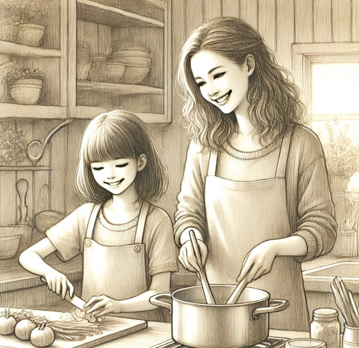 Finally, we sit down to eat. The pancakes are soft, and the fruit salad is fresh. "Thank you, Mom! I love cooking with you," I say.