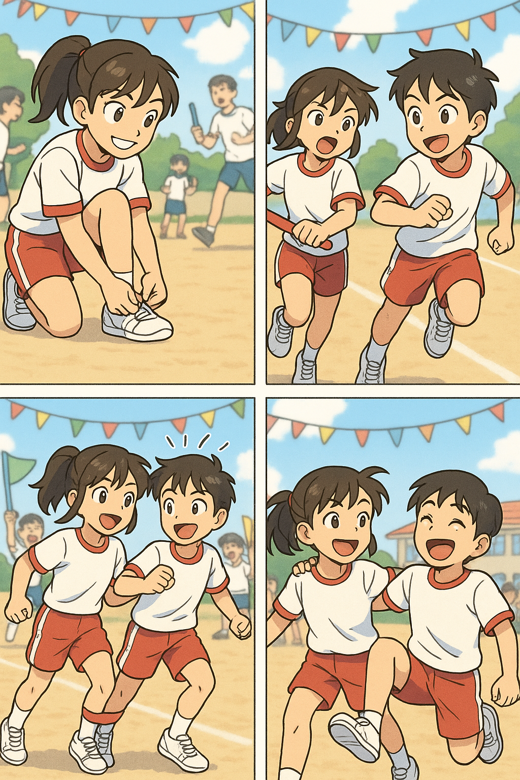 첫 번째 경기는 계주였다. 둘은 같은 팀에 속해 있었다.