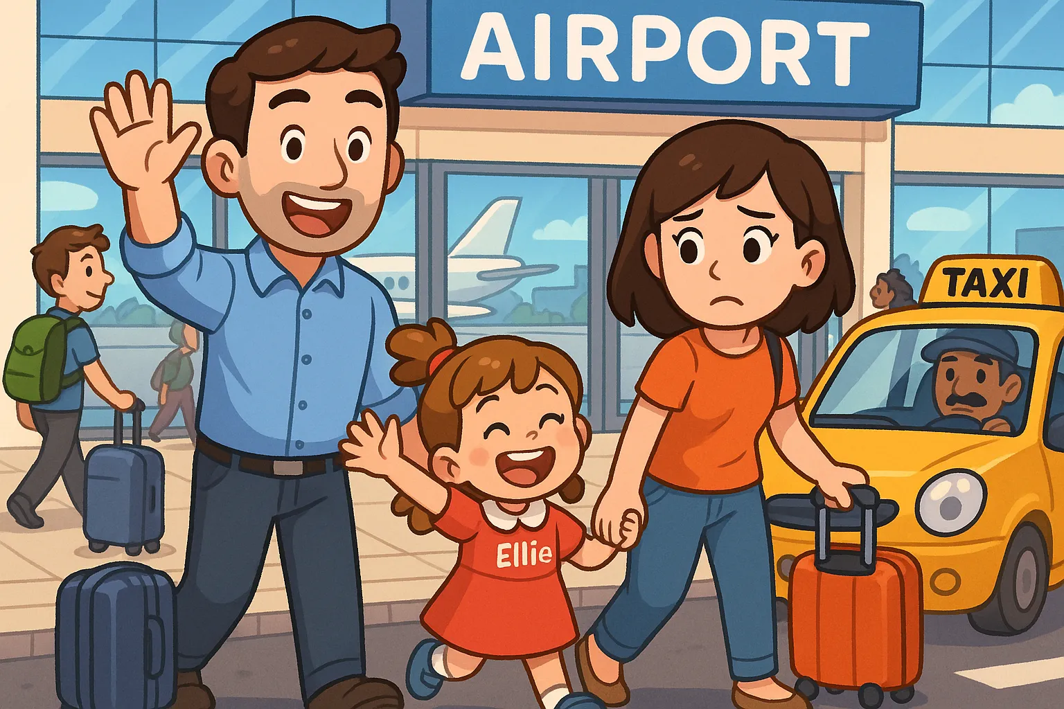 As we reach the curb, the thought of navigating public transport with all our luggage makes us realize we are too tired. After a long flight, the idea of a direct ride is far more appealing. So, Dad quickly flags down a taxi that pulls up to the curb. The taxi driver, a kind-looking person, immediately gets out to help us put in our bags, making the process smooth and easy. Once we're all settled inside, Dad clearly tells the driver, “Please take us to Maple Hotel.” The driver, understanding our request, smiles and says okay, ready to start the journey.
