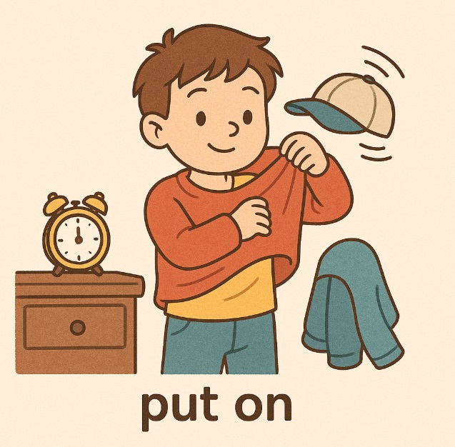 3 put on 입다, 신다, 쓰다 I put on my shoes.