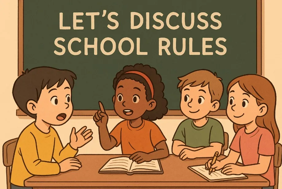 오늘 학교에서 선생님이 우리에게 학교 규칙에 대해 이야기해보자고 하셨어요.