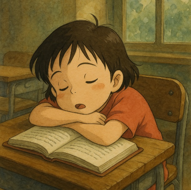 “너 잠들었어! 근데 걱정 마, 선생님한테 말 안 했어.”